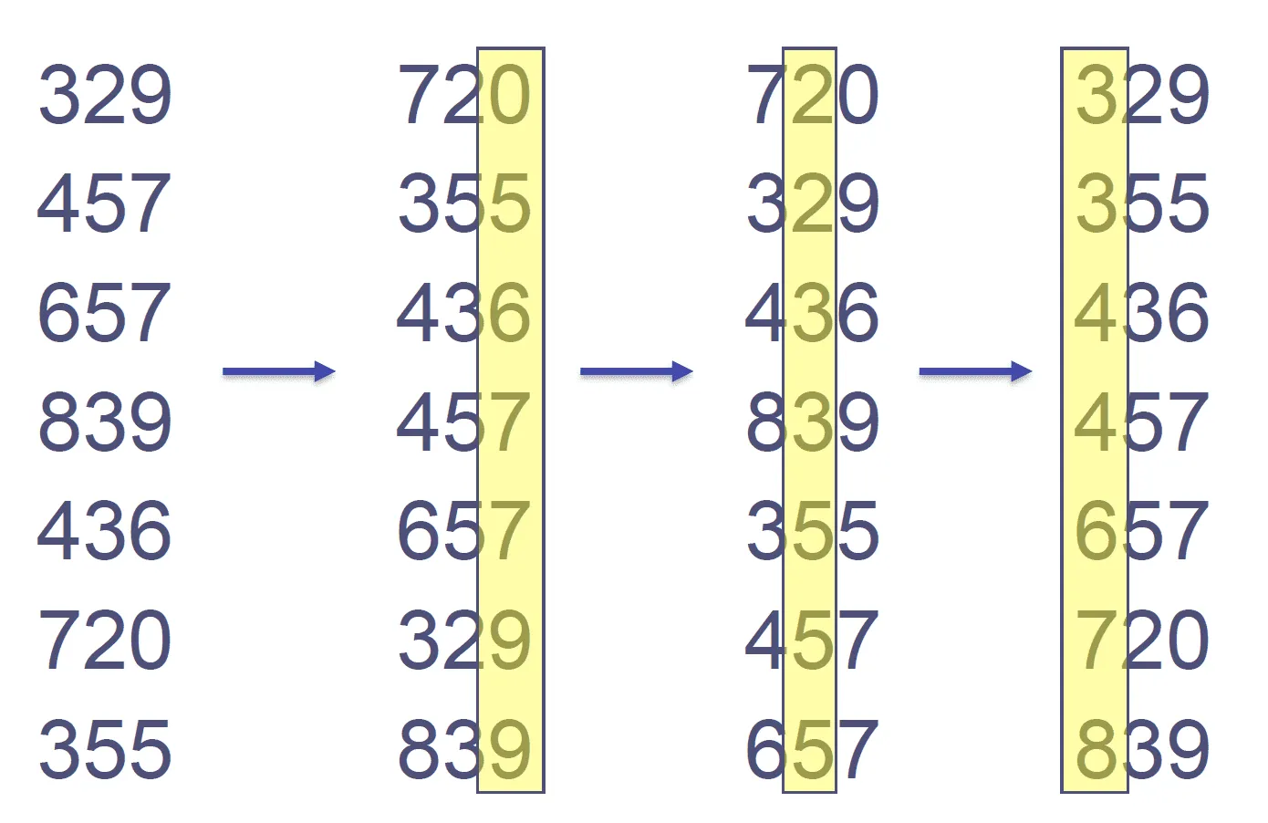 So for our 824 number I’d move it into the 7th index (count from zero) on my first look. The next iteration I’ll move it into the 1st bucket, and the third iteration to the 3rd bucket.